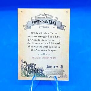 The product is a 2017 Topps Gypsy Queen trading card featuring Ervin Santana of the Minnesota Twins in Major League Baseball. This baseball card is from the base set of the 2017 Topps Gypsy Queen collection manufactured by Topps. With a card number of 258, this sports trading card is a valuable collectible for fans of Ervin Santana and the Minnesota Twins.