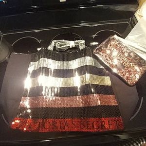 Gorgeous sequined tote and cosmetic bag. Sequined stripes running across the front of the tote. 2 carrying handles. Zipper on the cosmetic bag.