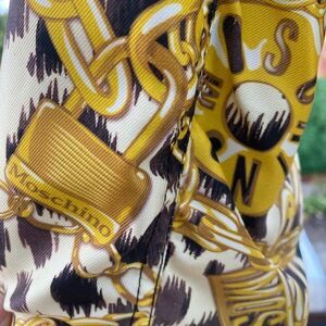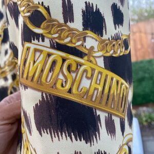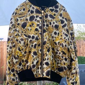 From the 2018 limited edition haute couture collection “Moschino x H&M” designed by Jeremy Scott (who dresses celebs like Katy Perry & Miley). This is a STUNNING silk bomber jacket with a “light puff” - very soft, warm and silky against your skin. Moschino logo featured all over it in the printed gold chains, locks, & necklaces. No H&M logo on outside of jacket. VERY oversized Unisex XS (fits Women’s S/M even when fully zipped). New with Tags. Perfect condition. This is an extremely RARE item!