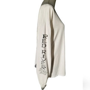White long sleeve 2018 Red River smoke skull graphic top. Both sleeves have large Red River lettering . Back has a black smoke skull with the Red River Run logo all on a Fruit of the Loom HD cotton fabric.