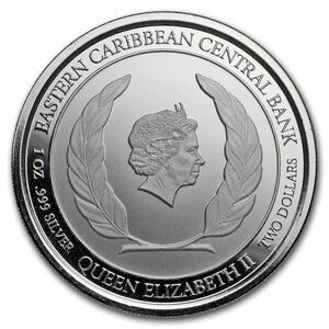 Obverse: Displays a right-facing portrait of Her Majesty Queen Elizabeth II framed by two evergreen laurels. Also inscribed are the weight, purity, and face value of 2 Dollars (XCD).
