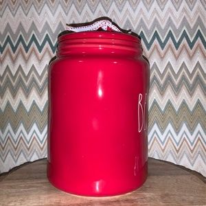 Rae Dunn red ceramic Be Mine canister with white LL lettering