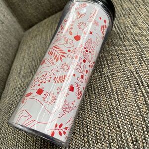 Starbucks 2019 holiday travel mug featuring red and white print of woodland creatures, foliage, pine, reindeer, fox, foliage, birds, rabbits and more. Screw cap with flip top and green and white Starbucks mermaid logo