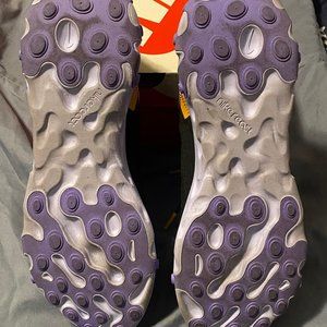 Borrowing design cues from Nike’s ACG line, the React Element 55 'Black Palest Purple' contrasts the sneaker’s black textile base with brightly hued accents throughout the upper. They include yellow heel overlays and vibrant pops of pink on the eyestay and Swoosh, both treated to a 3M reflective finish. Lightweight cushioning comes courtesy of a React foam midsole in a soft violet hue, complete with rubber pods on the sidewall and outsole for durable traction.