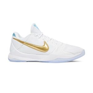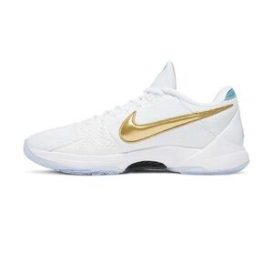 Dynamic Nike Kobe sneakers with contrasting designs. One shoe in white with gold highlights. The other in black with gold and green accents. Ideal for standout style on the court.