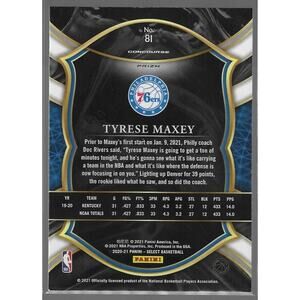 Celebrate the basketball season with this incredible sports trading card featuring Tyrese Maxey from the 2020-21 Panini Select set. This card showcases Maxey as a rookie and is a must-have for any fan of the sport. The card is a Concourse Silver Prizm variety and bears the card number 81.