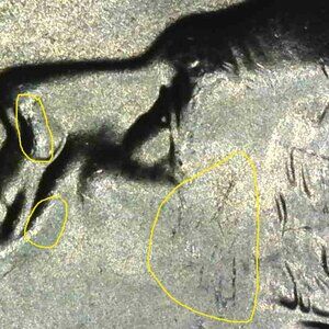 This coin does have DIE CHIPS as shown/marked on the face picture, and as shown as marks on the front bust on the cheek. These are MINT ERRORs, not scratches or defects. Dies for the coins, even though highly lubricated because of the intense pressure/heat involved, will have chips break off an attach to the coin. As a result, the DIE CHIPS become raised metal on the face of the coin and are quite common all all coins. They are considered a MINT ERROR, and each coin is unique - a collector's dream.