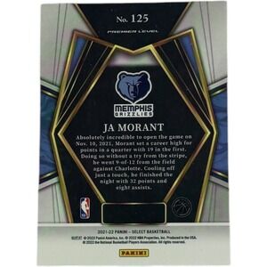 2021-2022 Panini Select Basketball Ja Morant Premier Level card number 125. This card highlights Ja Morant's exceptional performance on November 10, 2021, where he scored 19 points in the first quarter and made 9 of 12 field goals against Charlotte, finishing the night with 32 points and 8 assists. Perfect for a collector, a gift for a basketball enthusiast, or a display piece.