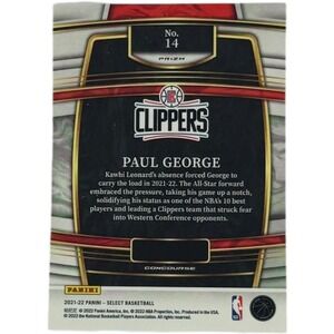 Keywords: Paul George, Clippers, Los Angeles, NBA, Basketball, Trading Card, Sports Card, Panini Select, Prizm, Concourse, 2021 2022, Player Card, Collectibles, Sports Memorabilia