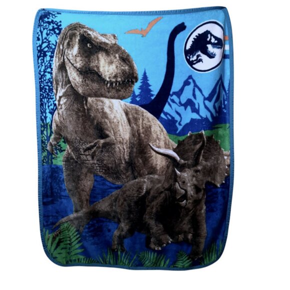 2021 Jurassic World T-Rex Triceratops Dinosaur Throw Blanket 45” X 32”. (**)