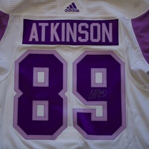 HFC jersey worn by Cam Atkinson Warm up worn on November 18, 2021. The number 89 is signed by Cam and comes with a CoA from the team/Meigray. There are puck marks/board burns on the right sleeve.