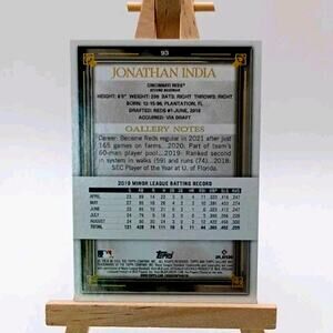 The product is a 2021 Topps Gallery trading card featuring Jonathan India, a rookie player for either the Kansas City Royals or Cincinnati Reds. This standard-sized card is from the 2021 Topps Gallery set and is a 1st Edition parallel variety. It is not autographed and is an original release by Topps, making it a valuable addition to any baseball card collection. With a focus on the MLB World Series and Major League Baseball, this card showcases India as a promising rookie player in the league.