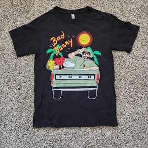 The 2022 Bad Bunny Album Promo T-Shirt in size Small features a graphic print with the iconic Latin rapper's logo, perfect for fans of reggaeton and hip hop music. Made from comfortable cotton jersey fabric, this short sleeve tee is suitable for all seasons and is machine washable for easy care. The black shirt with a crew neck and regular fit is a stylish and fun addition to any wardrobe, representing the vibrant and unique style of Bad Bunny.