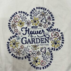 Harness the "flower power" of this fanciful fashion tee with floral lace sleeves, Figment art, and EPCOT International Flower and Garden Festival 2022 logo.