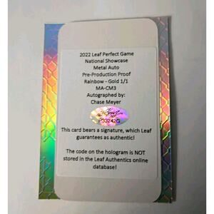 The 2022 Leaf Metal Perfect Game Chase Meyer Autograph Pre Production Proof 1/1 trading card is a highly sought-after collectible in the sports trading card world. This one-of-a-kind card features an autograph from baseball player Chase Meyer and is made of high-quality card stock with a metal finish. With a limited print run of 1, this unique card is sure to be a standout piece in any collection, especially with its Rainbow Prizm parallel variety and serial numbered design. Collectors will appreciate the rarity and exclusivity of this special Chase Meyer trading card.