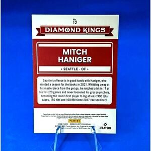 The product is a 2022 Panini Donruss Optic Baseball Diamond Kings trading card featuring Mitch Haniger of the Seattle Mariners. This card is part of the Diamond parallel variety set and is numbered 12 in the 2022 season. The card is non-autographed and falls under the category of Sports Trading Cards for baseball fans and collectors.