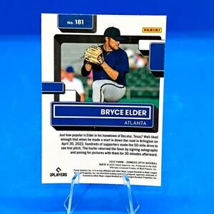 The product is a 2022 Panini Donruss Optic Rated Rookie trading card featuring Bryce Elder from the Atlanta Braves. This sports trading card is part of the MLB set for the 2022 season, manufactured by Panini. Made from card stock and metal materials, this card is a part of the base set and is designated with card number 181. As a Rated Rookie card, it holds significance for collectors and fans looking to add a valuable piece to their collection.