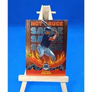 The 2022 Panini Mosaic Hot Sauce Juan Soto trading card is a sought-after collectible item for baseball fans and card enthusiasts. Featuring the talented player from the Washington Nationals, this card is part of the Hot Sauce insert set, adding a unique and spicy twist to the collection. With its exclusive design and limited availability, this card is a valuable addition to any sports trading card collection.