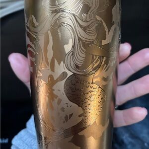 The object is a Starbucks 2022 Spring Ceramic Gold Copper Siren Mermaid Tumbler Mug Cup.