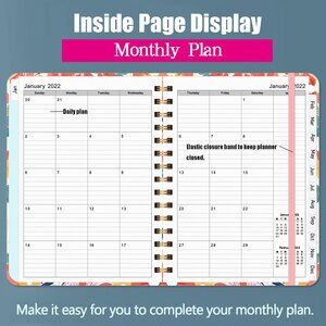 Strong 24-hole double-coil binding for the 2022 planner+Colorful flower cover+Month index+Back pocket which can hold some cards+Elastic closure band to keep planner closed.