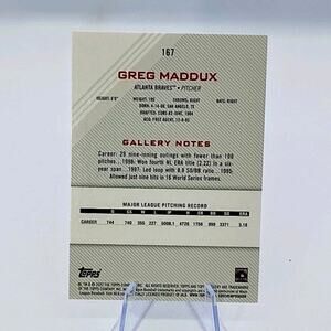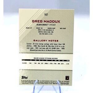 The 2022 Topps Gallery trading card features baseball legend Greg Maddux, who played for the Atlanta Braves in Major League Baseball. This sports trading card is part of the base set for the 2022 season, manufactured by Topps. The card showcases Maddux in his Braves uniform and is numbered 167 in the series. A must-have for fans and collectors alike, this card captures a piece of baseball history in a collectible form.