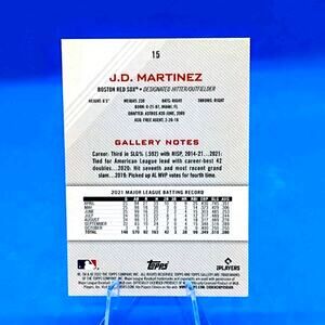 The 2022 Topps Gallery trading card featuring J.D. Martinez from the Boston Red Sox is a highly sought-after collectible item for baseball fans and card collectors alike. Produced by Topps, the card is part of the 2022 Topps Gallery set and is numbered as #15. This baseball trading card showcases Martinez in action, making it a valuable addition to any collection focusing on Major League Baseball.