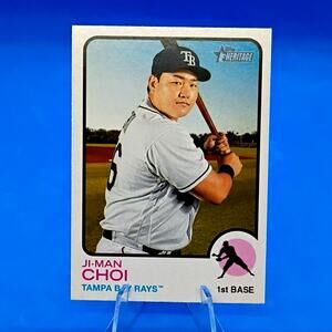 The product is a 2022 Topps Heritage baseball trading card featuring player Ji-Man Choi from the Tampa Bay Rays. This sports trading card is part of the base set for the 2022 season, manufactured by Topps. With a card number of 393, this collectible item is a must-have for fans and collectors of Major League Baseball memorabilia.