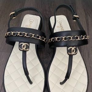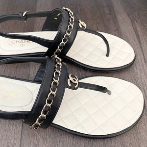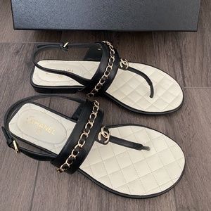 2023 CHANEL CC LOGO BLACK THONG LEATHER FLAT SHOES SANDALS SIZE 37.