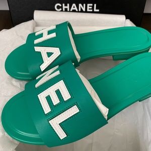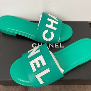 2023 CHANEL GREEN LEATHER CC LOGO SLIDES !!!!