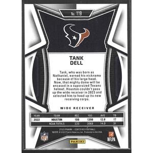 This 2023 Certified Tank Dell Rookie Card is a must-have for fans of the Houston Texans and Houston Cougars. The card features a Bronze Mirror Parallel/Variety and is one of only 275 printed. It is an ungraded Condition Type and is in near mint or better Card Condition. The card is manufactured by Panini and is part of the Sports Trading Card Type.
