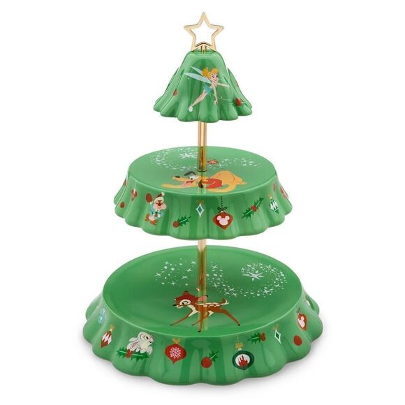 Provide meal times with a taste of the holidays with this festive tray that will deliver tiers of joy. The Christmas tree design, featuring ceramic tiers set around a central goldtone metal post topped with a star, includes colourful artwork of popular Disney characters & holiday decorations!