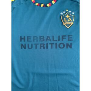 Limited-edition 2023 LA Galaxy Adidas Hispanic Heritage Month Pre-Match Jersey featuring a teal base with red, yellow, and green patterned trim inspired by Hispanic cultural motifs. Heat-sealed LA Galaxy crest and Herbalife Nutrition branding complete the design. Made with adidas AEROREADY moisture-wicking fabric — a rare, collectible soccer piece celebrating heritage and team pride.