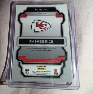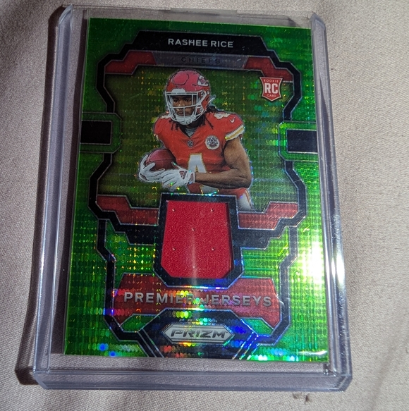 The 2023 Panini Prizm Premier Jerseys Rashee Rice #PJ-RR Neon Green Pulsar trading card is a highly sought-after collectible for football fans and card enthusiasts. Featuring a piece of jersey memorabilia from NFL player Rashee Rice of the Kansas City Chiefs, this card is a rare find within the Premier Jerseys insert set. The neon green pulsar design adds a unique and vibrant touch to this rookie card, making it a valuable addition to any sports card collection.