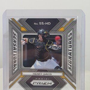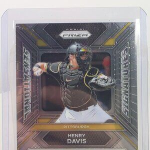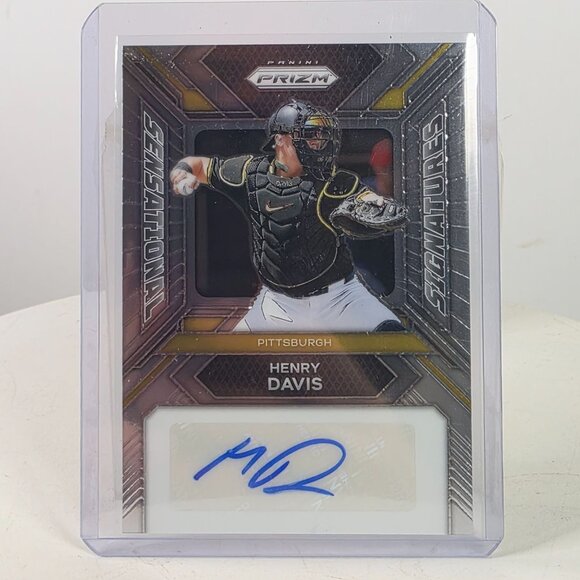This Henry Davis rookie card, part of the 2023 Panini Prizm Sensational Signatures series, showcases a bold autograph and a dynamic design. Featuring Davis in action as a catcher for Pittsburgh, this collectible is an essential addition to a sports memorabilia collection, encapsulated for pristine preservation.