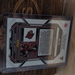 Here's a cool short print orange pulsar prizm card of Lamar Jackson, star quarterback of the Baltimore Ravens.