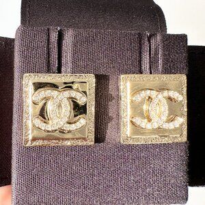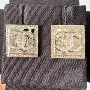 2023P CHANEL RUNWAY SQUARE GOLD CC LOGO WHITE CRYSTALS EARRINGS STUDS. BRAND NEW IN BOX WITHOUT TAG.