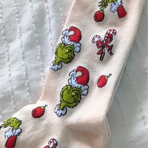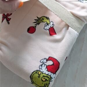 2024 super soft and cozy AE X Grinch pajama set. Cropped long sleeve top, and shorts with AEO logo on band. Light pink color with Santa Grinch and Candy canes and red ornaments all over. Matching crew socks. Great PJ's for winter/Christmas season!