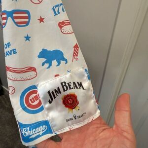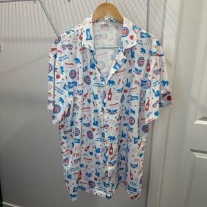 Celebrate America’s birthday in style with this exclusive 2024 Chicago Cubs SGA Fourth of July Hawaiian Shirt, size XXL, from the July 4, 2024 giveaway at Wrigley Field. This short-sleeve button-down features a vibrant all-over print on a white base, including Cubs logos, baseballs, hot dogs, sunglasses, the Statue of Liberty, bears, 1776 motifs, “Home of the Brave” banners, Chicago flags, airplanes, and other patriotic and team-themed icons in red, white, and blue. Made from lightweight, breathable fabric ideal for summer, it’s perfect for game days, barbecues, or casual wear. New condition from a smoke-free, pet-free home—never worn, ready to ship. A must-have for Cubs fans and collectors! Machine washable for easy care. Don’t miss this limited-edition piece commemorating the holiday game against the Phillies.