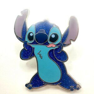 Add a touch of sparkle and mischief to your Disney pin collection with this officially licensed 2024 Disney Pins enamel pin featuring Stitch from Lilo & Stitch. This charming pin shows Stitch in a playful pose, pulling at his cheeks, with a glittery deep-blue finish and bright turquoise belly. Perfect for collectors, traders, and fans of this lovable alien experiment.
