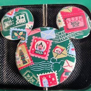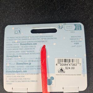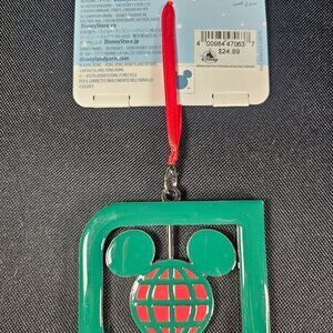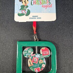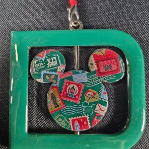 Make your holiday decor festive this season with the Mickey Mouse Icon D spinner ornament, featuring a Spinner Mickey Mouse icon with stamp postcards on one side. Flat design. Cut out Mickey Mouse icon shape spinner. Red fabric ribbon for hanging. 3.5 inches high, 3.5 inches wide approximate. Authentic Disney park merchandise. Metal. Imported. Non-smoking pet free home.