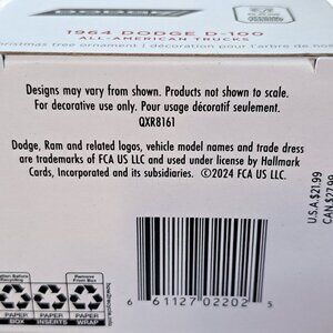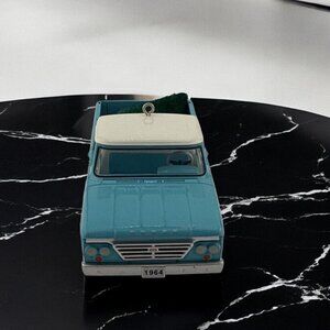 This 1964 Dodge D-100 Hallmark Keepsake Christmas ornament features the classic teal and white pick-up truck in die-cast metal with wheels that turn and a bottle brush tree in back. 30th in the All-American Trucks Keepsake Ornament series. Message: (front license plate) 1964 (rear license plate) 2024