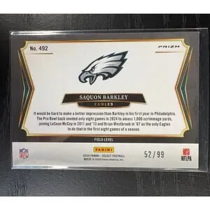 This stunning piece features the dynamic Saquon Barkley in action, expertly captured within the desirable Field Level design. What truly sets this card apart is its exceptional rarity – it's a Tri-Color Prizm parallel, individually numbered out of a mere 99 copies worldwide, making it a true collector's gem.