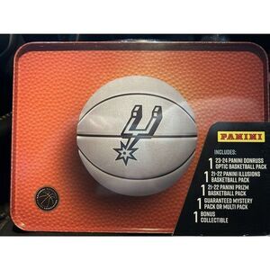 The product is a 2024 Panini Spurs Victor Wembanyama lunch box tin featuring Wemby ROY. It is a sports trading card set from the National Basketball Association (NBA), specifically focusing on the San Antonio Spurs team. The tin box contains 4 packs of standard-size cards made of cardstock, manufactured by Panini from 2021-2024,a Mystery Bonus pack and also a possible NBA floor piece collectible.It is a sealed box w/ multiple cards random inserted are stars and rookie cards like Victor Wembanyama, standard lunchbox size..