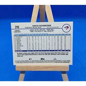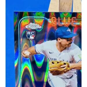 The product is a 2024 Topps Chrome baseball trading card featuring Davis Schneider, a rookie player for the Toronto Blue Jays. This specific card is a RayWave Refractor parallel, adding a unique design element to the base set collection. As a highly sought-after collectible in the sports trading card market, it appeals to fans and collectors looking to add a rare and valuable piece to their collection.
