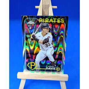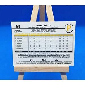 The product is a 2024 Topps Chrome trading card featuring Major League Baseball player Henry Davis, from the Pittsburgh Pirates. This specific card is a #260 RayWave Refractor, made from a combination of card stock and metal. As a rookie card from the 2024 set, it holds value for collectors and fans of the sport. The RayWave Refractor adds a unique and eye-catching element to this particular baseball trading card.