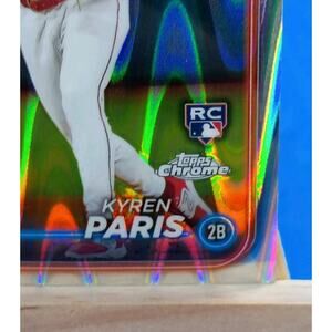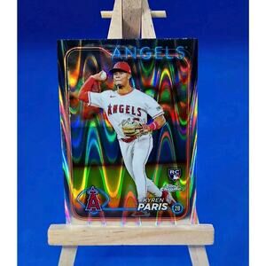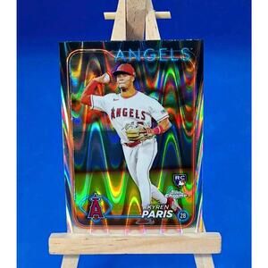 The product is a 2024 Topps Chrome baseball trading card featuring Kyren Paris of the Los Angeles Angels. This specific card is a RayWave Refractor parallel variety, making it a unique and collectible item for fans and collectors. Made of card stock and metal materials, this rookie card is part of the base set for the 2024 season, showcasing the player in a striking design that is sure to appeal to baseball enthusiasts looking to add a special piece to their collection.