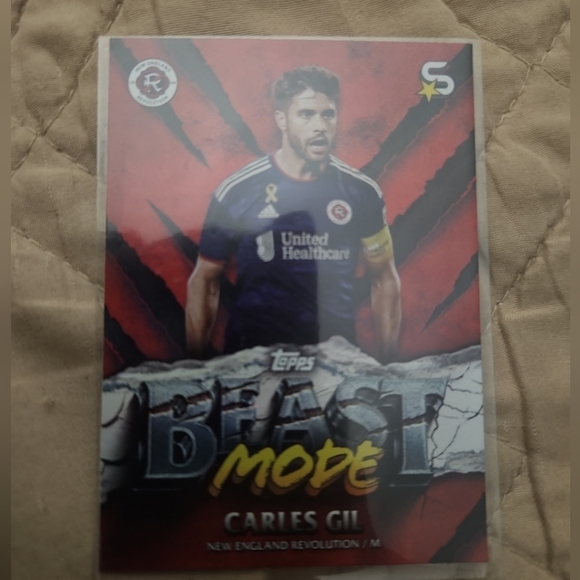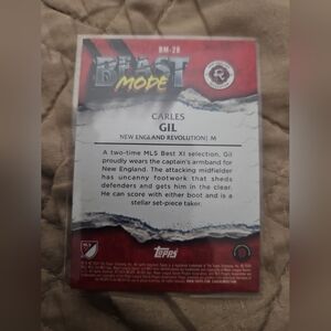 The product is a 2024 Topps MLS Superstars trading card featuring Carles Gil in BEAST MODE. This original card is from the Major League Soccer set and showcases the player in a unique design from the Beast Modes insert set. The card is in near mint or better condition and is a must-have for fans of the New England Revolution and soccer enthusiasts alike.