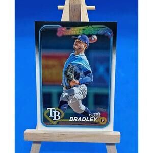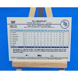 The product is a 2024 Topps Series 2 trading card featuring Taj Bradley of the Tampa Bay Rays. This baseball card is part of the Topps Future Stars subset, with card number 589. It is a base set card manufactured by Topps for Major League Baseball fans and collectors, focusing on promising young players like Bradley. This card is a valuable addition to any sports trading card collection, especially for fans of the Tampa Bay Rays or collectors of baseball memorabilia.