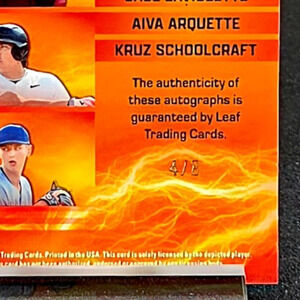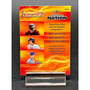 The is an autographed trading card featuring three baseball players including Jace LaViolette, Kruz Schoolcraft and Aiva Arquette. Great new Rookies for the Cleveland Guardians, Miami Marlins and San Diego Padres.