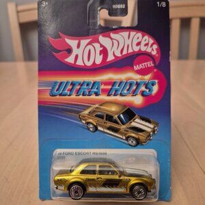 The 2025 Hot Wheels Ultra Hots '70 Ford Escort RS1600 in Spectraflame Gold is a limited edition diecast car model in 1:64 scale. Part of the Hot Wheels Ultra Hots series, this Ford Escort RS1600 features a unique gold color and is a part of the National Hot Rod Association theme. This collectible toy vehicle is suitable for various age levels and comes in an unopened box, making it a sought-after piece for car enthusiasts and collectors. Made in Malaysia, this Hot Wheels car is a valuable addition to any diecast collection, especially for fans of The Fast and the Furious franchise.